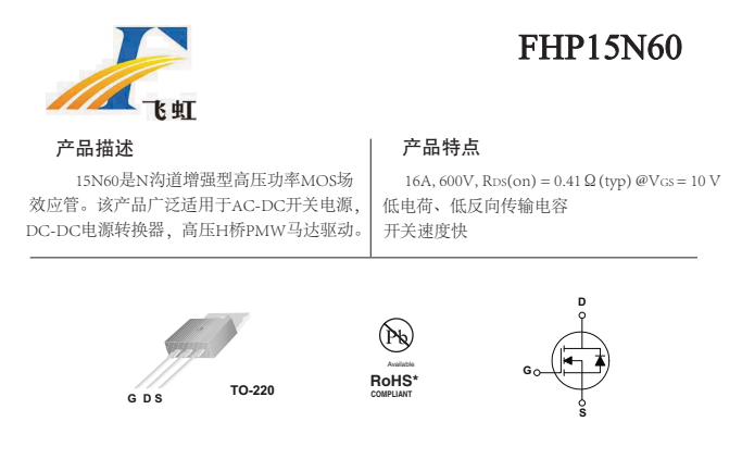 FHP15N60的主要封裝形式是TO-220、TO-220F、TO-3PN,腳位排列位GDS。這款15N60場(chǎng)效應(yīng)管產(chǎn)品具體參數(shù):Vgs(±V):30;VTH(V):3-5;ID(A):16;BVdss(V):600。RDS (on) = 0.41mΩ(typ)@V GS =10V,低電荷、低反向傳輸電容開關(guān)速度快的特點(diǎn)。
