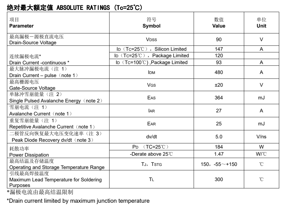其產(chǎn)品參數(shù):具有120A電流、90V電壓, RDS(on) = 5.4mΩ(max),最高柵源電壓 @VGS =±20 V,SGT 工藝、RoHS 產(chǎn)品、100%經(jīng)過熱阻測試、100%經(jīng)過雪崩測試、100%經(jīng)過 Rg 測試、開關(guān)速度快、低 Crss (典型值 pF)、低柵極電荷的特點。
