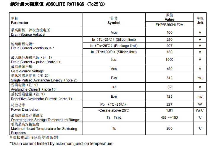 當然,MPPT控制器MOS管,FHP250N1F2A在應用中,我們逆變器研發工程師一定要了解這款優質FHP250N1F2A國產場效應管的詳細參數:其具有250A、100V的電流、電壓, RDS(on) = 3.0mΩ(MAX) @VGS = 10 V,RDS(on) = 2.5mΩ(TYP) @VGS = 10 V,最高柵源電壓@VGS =±20 V。